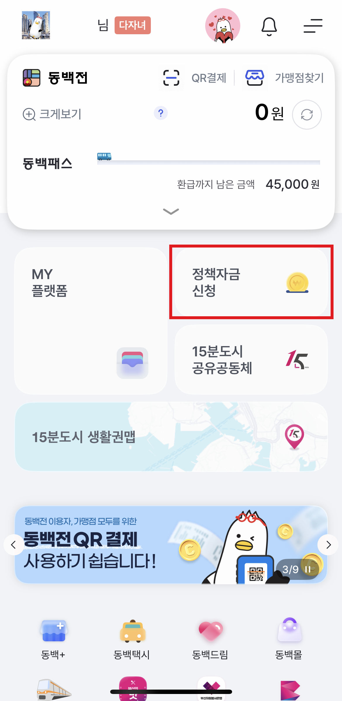 - 동백전 앱을 통한 신청(방문, 우편접수 불가)