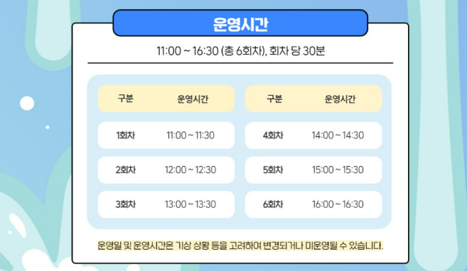 운영일 및 운영시간은 기상 상황 등을 고려하여 변경되거나 미운영될 수 있습니다.